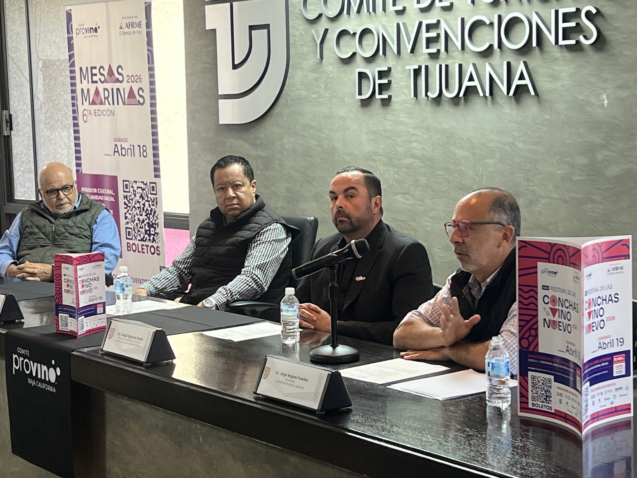 En la conferencia también estuvieron el Lic. Sergio Egozcue Ayala, delegado Metropolitano de Turismo del estado; Lic. Erick Peterson, representante del sector acuícola y director de Baja Shellfish Farms; y el Lic. Jorge Noguez Fuentes, secretario del Comité Provino Baja California.